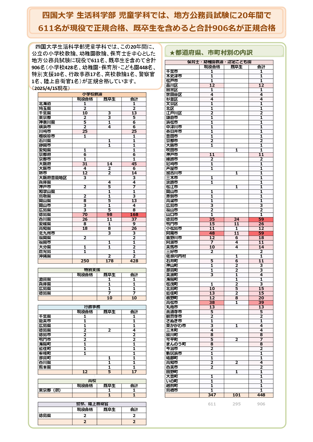 四国大学生活科学部児童学科での地方公務員試験合格者数について(2025年4月15日現在)