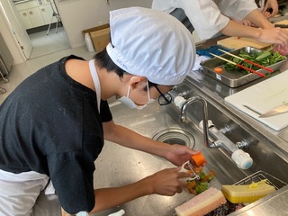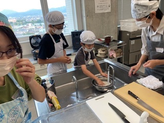 当日は、学生スタッフによる料理の説明のあと徳島の特産品を使ったメニューとして、おにぎらず、鳴門金時のチーズコロッケ、卵スープ、すだちゼリー調理を開始。
