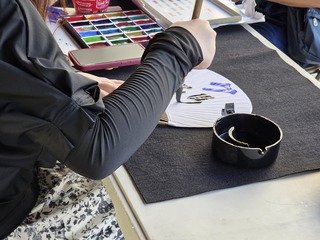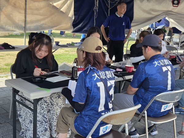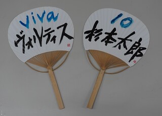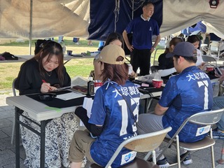 令和7年8月30日(土)、鳴門・大塚スポーツパークで「2025明治安田生命J2リーグ 徳島ヴォルティスVSブラウブリッツ秋田」が実施されました。同日同会場でホームゲームイベント「徳島市民デー」も開催され、徳島市ブースで、本学の書道文化学科学生3名が、、うちわへ応援メッセージを揮毫するワークショップを行いました。